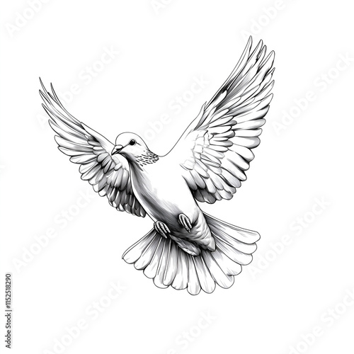 © Anuson, Fototapeta premium Beautiful line art illustration of a fully flying dove, white background