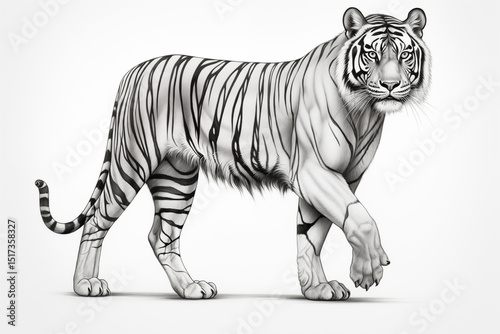 © Aom, Naklejka premium Beautiful line art illustration of a whole white tiger on a white background in black and white style.