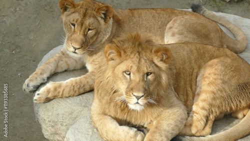 © komi$ar, Obraz premium beautiful lion family relaxing on rocks