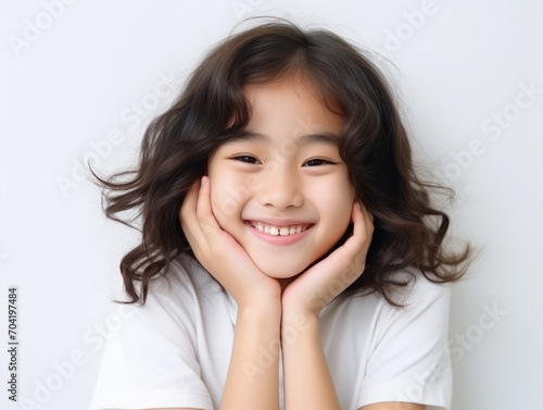 Fototapeta premium Beautiful little asian child puts hand on chin isolated on white background
