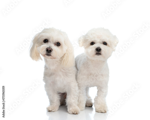 © Viorel Sima, Obraz premium beautiful little bichon dogs looking forward, sitting and standing next to eachother