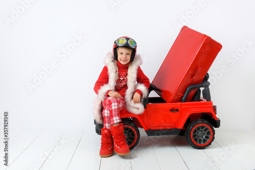 Fototapeta premium Beautiful little boy dressed like Santa Claus helper. Christmas concept....