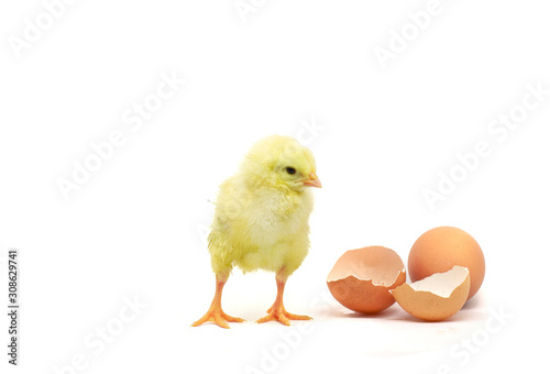 Fototapeta premium beautiful little chicken, egg and eggshell isolated on the white