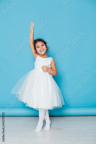 Naklejka premium Beautiful little girl dances to the song in a white dress on a blue background