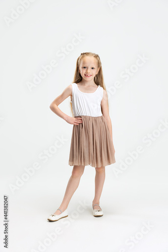 Naklejka premium Beautiful little girl in modern stylish dress posing isolated on white studio background. Happy childhood concept.