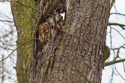 © Roman Bjuty, Obraz premium Beautiful little owl Little Owl - Strix aluco sitting in a hollowed out tree trunk.