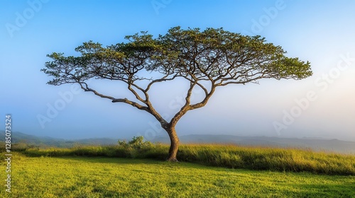© Asraf, Obraz premium Beautiful Lone Tree on Green Hillside Against a Clear Blue Sky and Soft Foggy Background