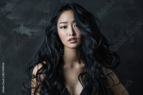 Fototapeta premium Beautiful long curly hair asian woman model hair smooth brunette hairstyle...