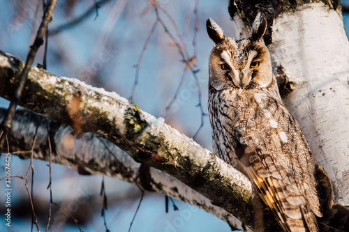Obraz premium Beautiful Long-eared owl sitting in a tree. (asio otus)