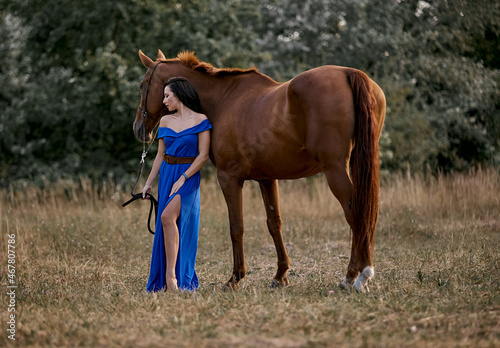 © Елизавета Мяловская, Fototapeta premium Beautiful long-haired girl in a blue dress with a red horse