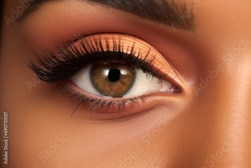 Obraz premium Beautiful macro shot of female African American brown eyes with peach fuzz eyeshadows