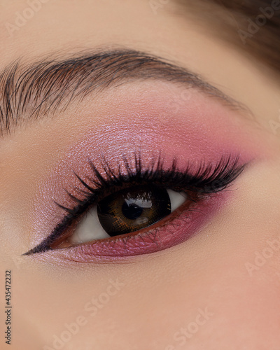 Obraz premium Beautiful macro shot of female eye make-up in pink smoky eyes style and arrow. Brown eye. Creative make-up. Perfect shape make-up and long lashes. Cosmetics. Beautiful eyes make-up. Close-up