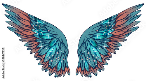 © Евгения Савченко, Fototapeta premium Beautiful magic glittery turquoise pink vector wings