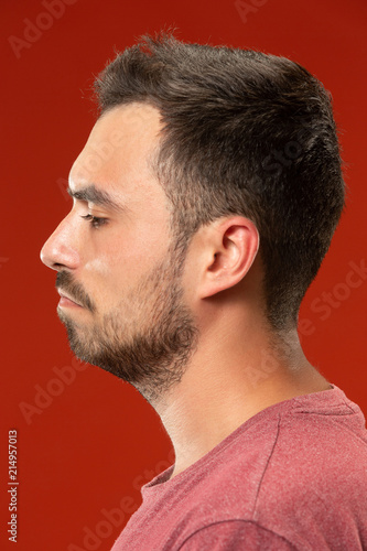 Fototapeta premium Beautiful man looking suprised and bewildered isolated on red
