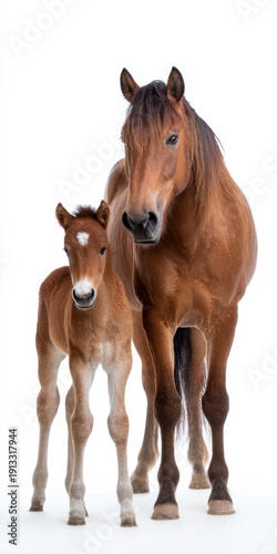 Obraz premium Beautiful mare and foal duo in studio portrait with white background