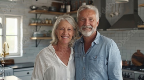 © PaulShlykov, Fototapeta premium Beautiful mature couple posing in modern kitchen interior