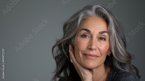 © Luiri Art, Fototapeta premium Beautiful mature woman with glowing skin from effective anti-aging treatments, on a grey background, with copy space, highlighting her confidence and commitment to self-care