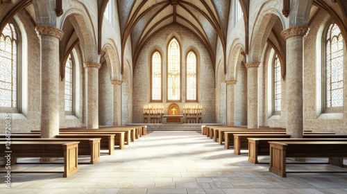 © Jakkarin, Fototapeta premium Beautiful Medieval Chapel Interior with Tall Arched Windows