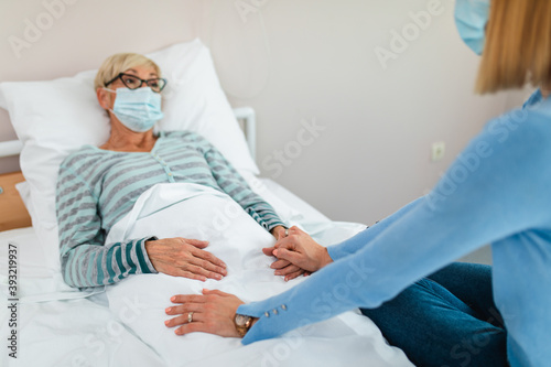 © hedgehog94, Obraz premium Beautiful middle age woman spending some time with her mother in hospital or nursing center. Senior woman lying in bed.