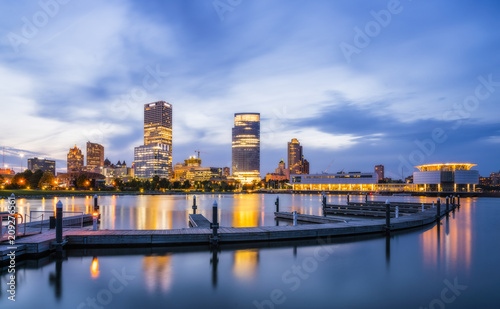 Naklejka premium beautiful milwaukee at night with reflection in water ,wisconsin,usa.