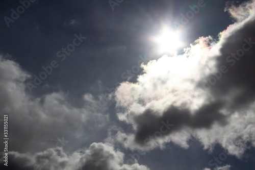 © Olga, Obraz premium Beautiful miracle with clouds in the dark blue sky. Sun light. God light against background