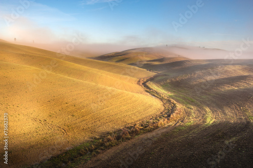 Naklejka premium Beautiful mists in rolling fields in Tuscany, Italy