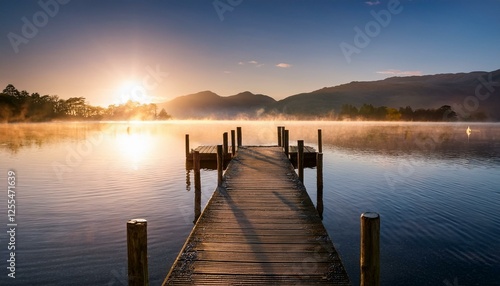 Fototapeta premium beautiful misty sunrise with wooden jetty at derwentwater in the lake...
