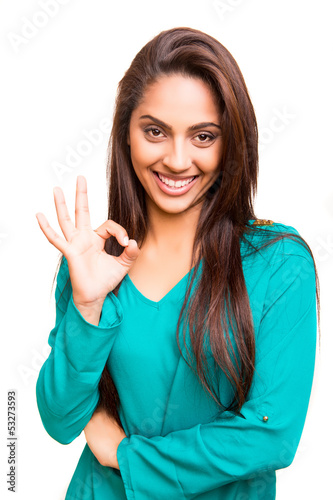 Fototapeta premium Beautiful mix race woman showing Ok sign