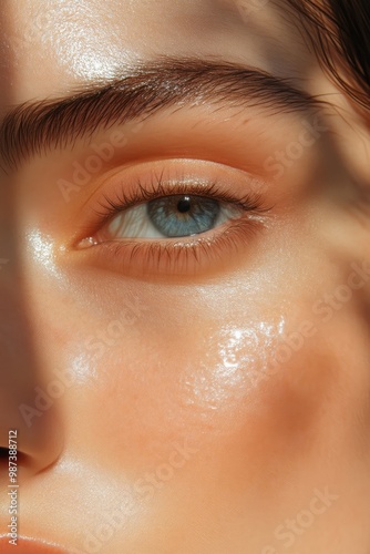 © Andrii , Fototapeta premium Beautiful Model with Serum on Face in Sunshine