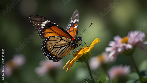 © Pramata, Fototapeta premium Beautiful monarch butterfly landing on a single yellow flower in a sunny garden. Nature concept