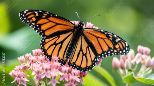 © Shozib, Fototapeta premium Beautiful monarch butterfly with open wings sitting on a pink flower in a garden