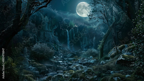 © FYA Al Kahfi, Obraz premium beautiful moonlight over the forest and waterfall