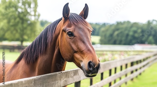 Fototapeta premium Beautiful Morgan Horse Gazing Over Rustic Wooden Fence in Picturesque Rural...