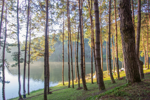 Naklejka premium Beautiful morning at Huai Pang tong Reservoir and pine forests at Pang...