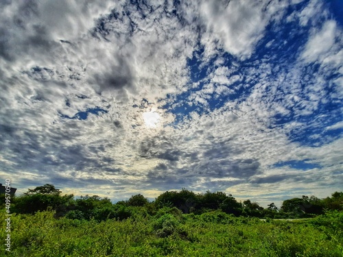 Obraz premium beautiful morning landscape with blue sky, white clouds, sun bright and green...