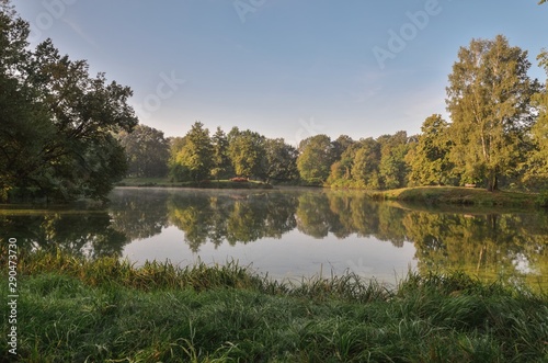 © shadowmoon30, Fototapeta premium Beautiful morning summer landscape. Green trees and plants by the pond in the park.
