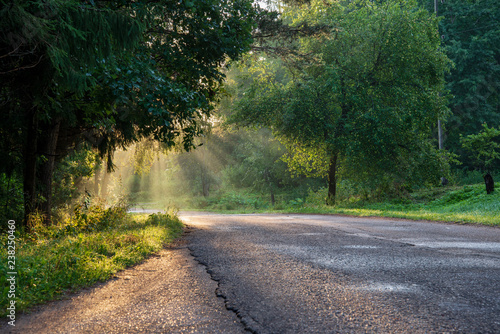 © Martins Vanags, Obraz premium beautiful morning sun light shining through the trees on the road, sun rays