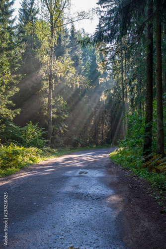 © Martins Vanags, Naklejka premium beautiful morning sun light shining through the trees on the road, sun rays