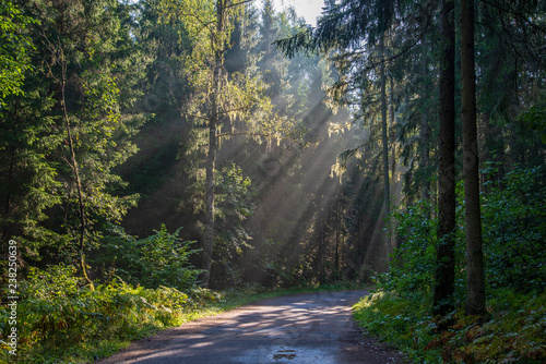 © Martins Vanags, Obraz premium beautiful morning sun light shining through the trees on the road, sun rays