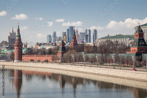 Obraz premium Beautiful Moscow Kremlin on the river bank. High towers. Sunny day. Ancient...