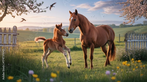 © Ross, Fototapeta premium Beautiful Mother Horse and Playful Foal in Blooming Countryside Pasture at Sunrise with Birds and Wooden Fence - Spring Farm Scene