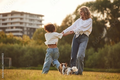 Obraz premium Beautiful mother with her little daughter and dog are on the summer field together
