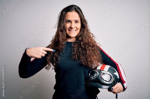 Obraz premium Beautiful motorcyclist woman with curly hair holding moto helmet over white background with surprise face pointing finger to himself