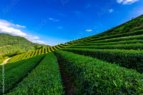© chanachon, Naklejka premium Beautiful mountain and nature tea plantations.
