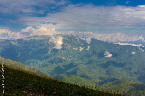Fototapeta premium Beautiful mountain landscape at Caucasus mountains with clouds and blue sky