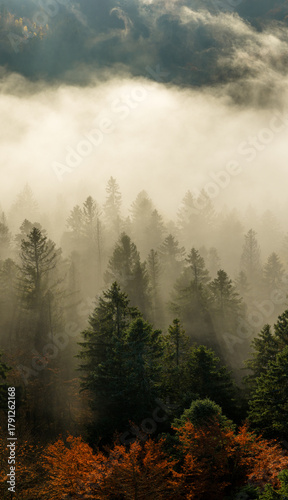 © Lukas Gojda, Naklejka premium Beautiful mountain landscape in fall with colorful trees and white fog , aerial view . Misty forest