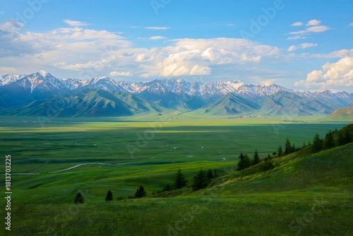 Fototapeta premium Beautiful mountain landscape scenic view green valley and snow peaks sky