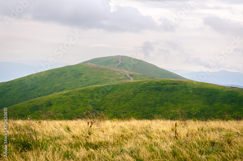 © Uladzimir, Fototapeta premium Beautiful mountain landscape with clouds. The road on the green top of Mount Ghimba in the Carpathians.