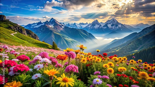 © Sujid, Fototapeta premium Beautiful mountain landscape with colorful flowers in focus, helping to enhance concentration and focus, nature