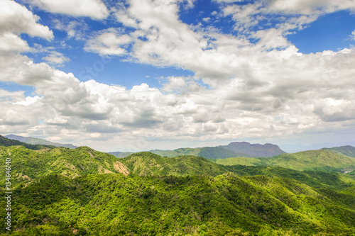 © waranyaphoto, Obraz premium Beautiful mountain landscape, with mountain peaks covered with forest and a cloudy sky